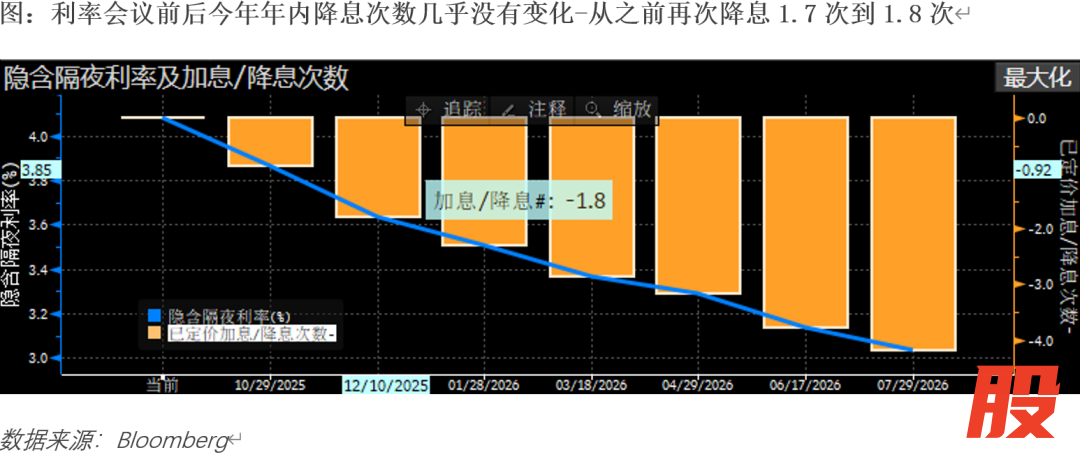 在答记者问的会议,市场关注了美联储还是继续缩表,被问及为什么不停止的时候,鲍威尔回答这是在计划之内的行为、现在看已经接近停止阶段。从而使得市场担心流动性的变化还会趋向紧张,实际上会议前后我们观察了一下流动性的变化:虽有紧张的压力、但还不严重,在会议之后甚至略有放松。所以是暂时没有危险信号、但需要持续关注的问题。这也从另一个层面印证了这是一次谨慎的预防式降息、而非应对衰退危机的补救式降息,甚至还有收紧流动性作为支撑,所以既不是鸽派转向、也不是开启了大幅降息之门。